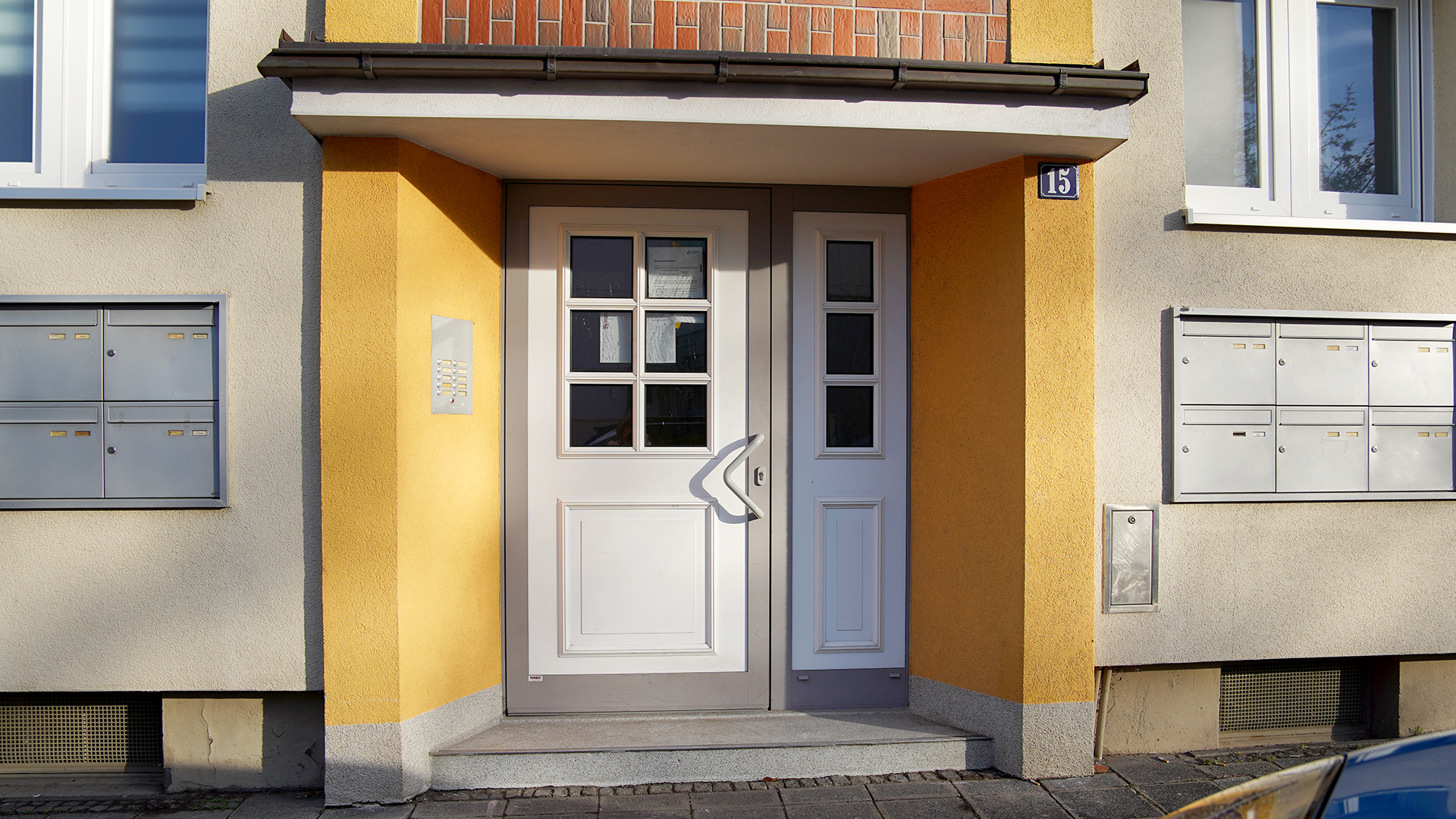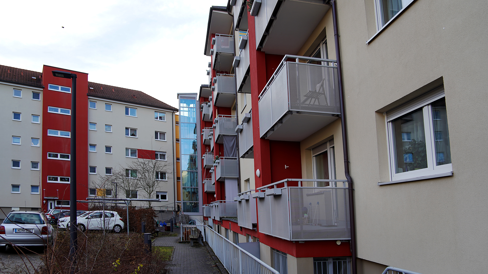 In den vergangenen Monaten wurden hier in 63 Wohnungen neue Fenster eingebaut, Heizungsstränge und Heizkörper erneuert sowie eine moderne Lüftungsanlage installiert. Verbunden mit dem Anbau von einem Aufzug und einer Photovoltaik-Anlage mit Stromspeicher sind die Gebäude nun fit für die Zukunft und erleichtern den Bewohnerinnen und Bewohnern erheblich den Alltag. Neue Eingangstüren zeigen gleich beim Betreten der Gebäude, dass hier modernisiert wurde.